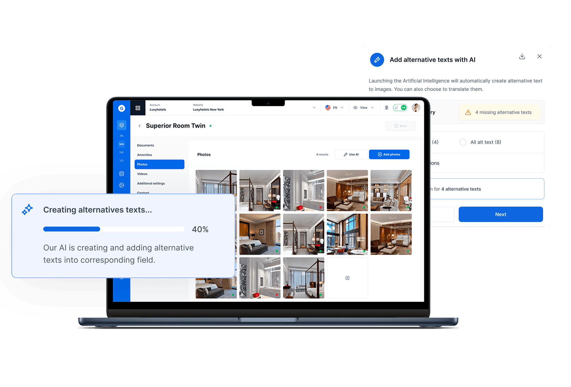 Quickly add relevant descriptions to your visuals thanks to AI. Improve your site's accessibility and SEO by generating precise, optimized text for each image.